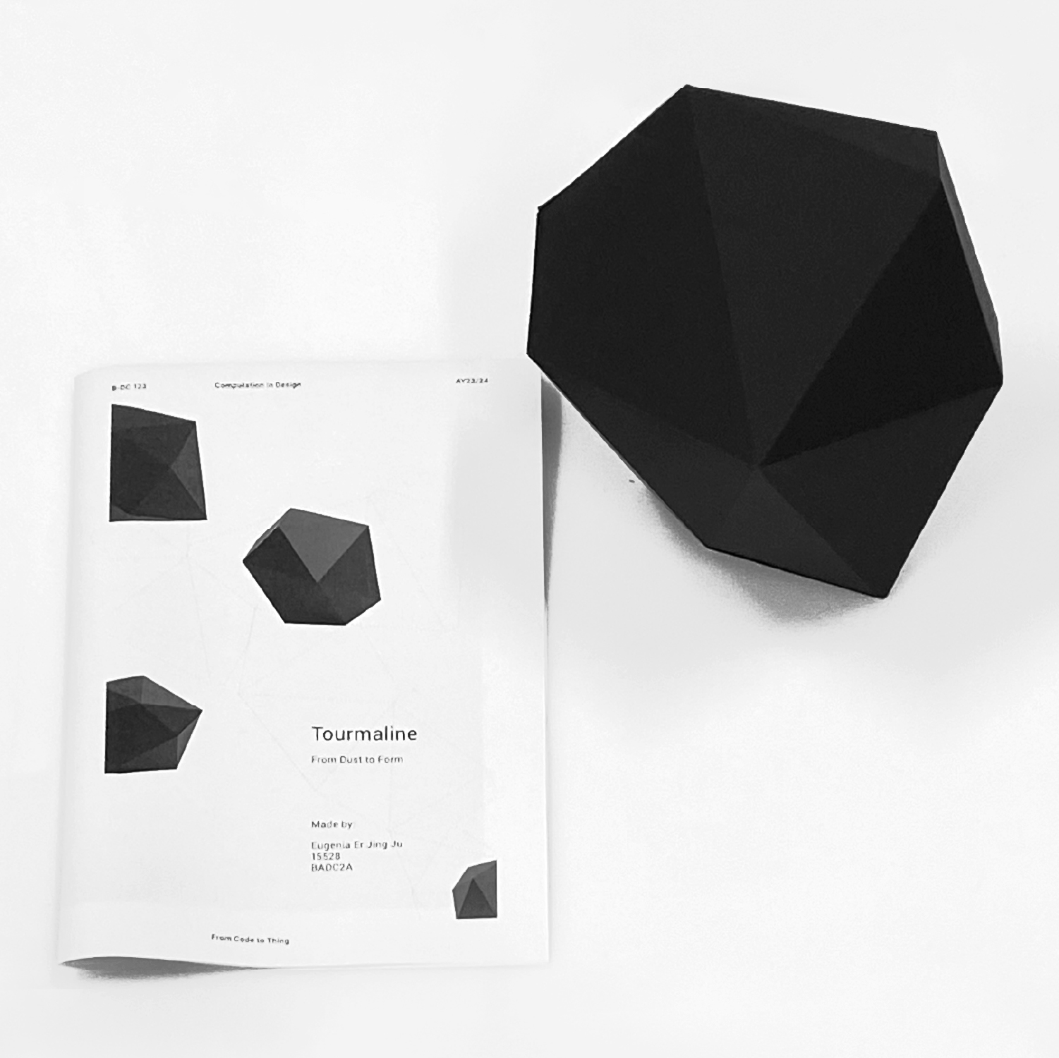 Taking inspiration from the formations of rocks from the cosmic space, I found similarities to the crystals named Black Tourmaline for their faceted, geometric shapes — utilising their forms as my main point of reference to generate and tweak my code through p5js.