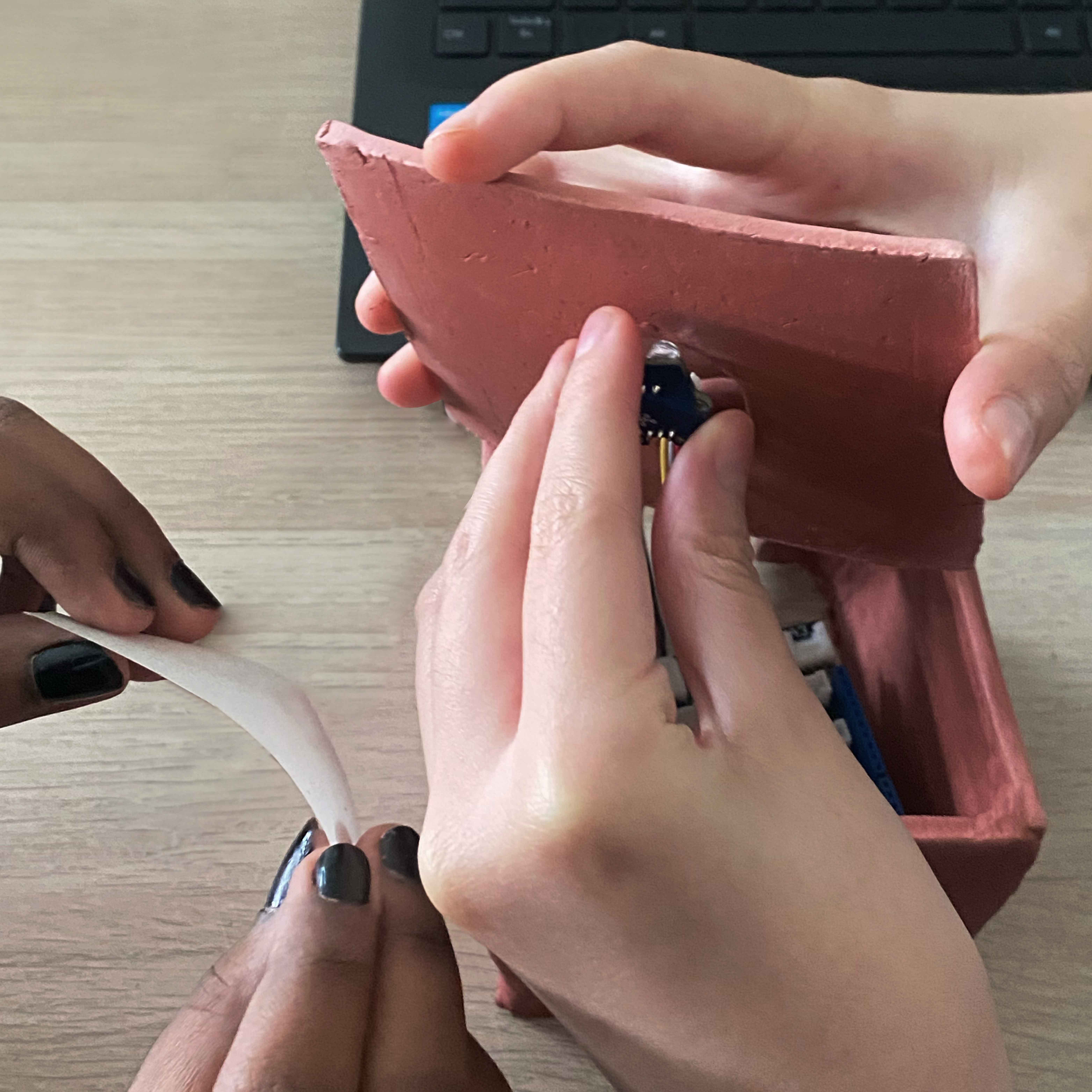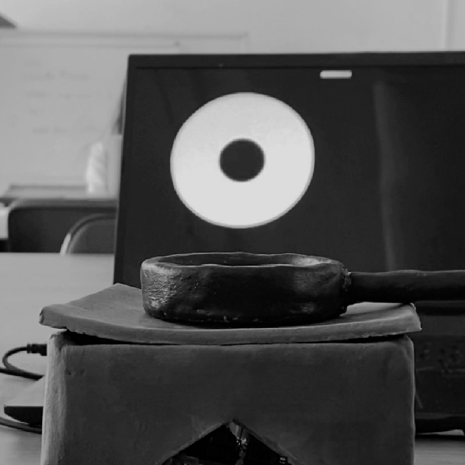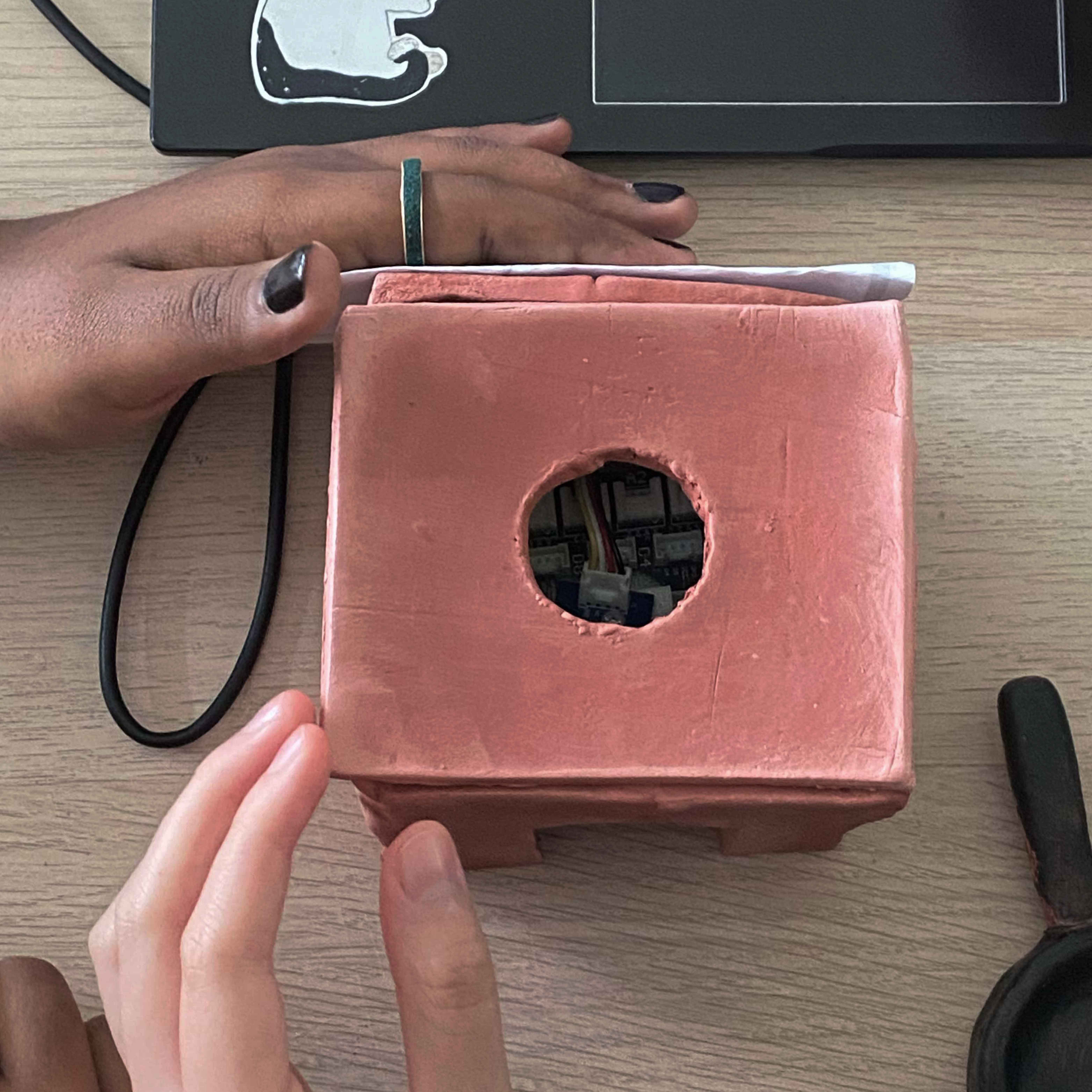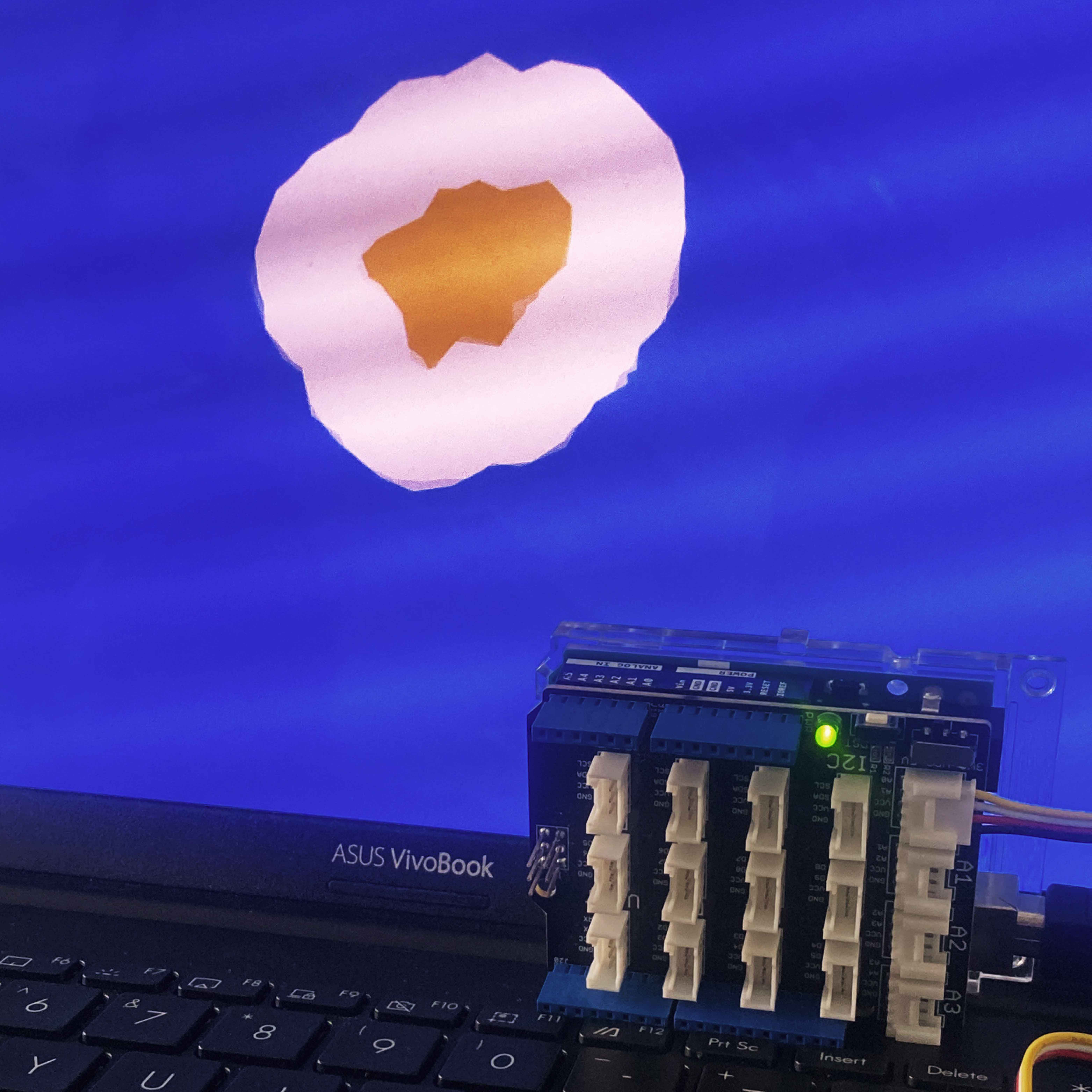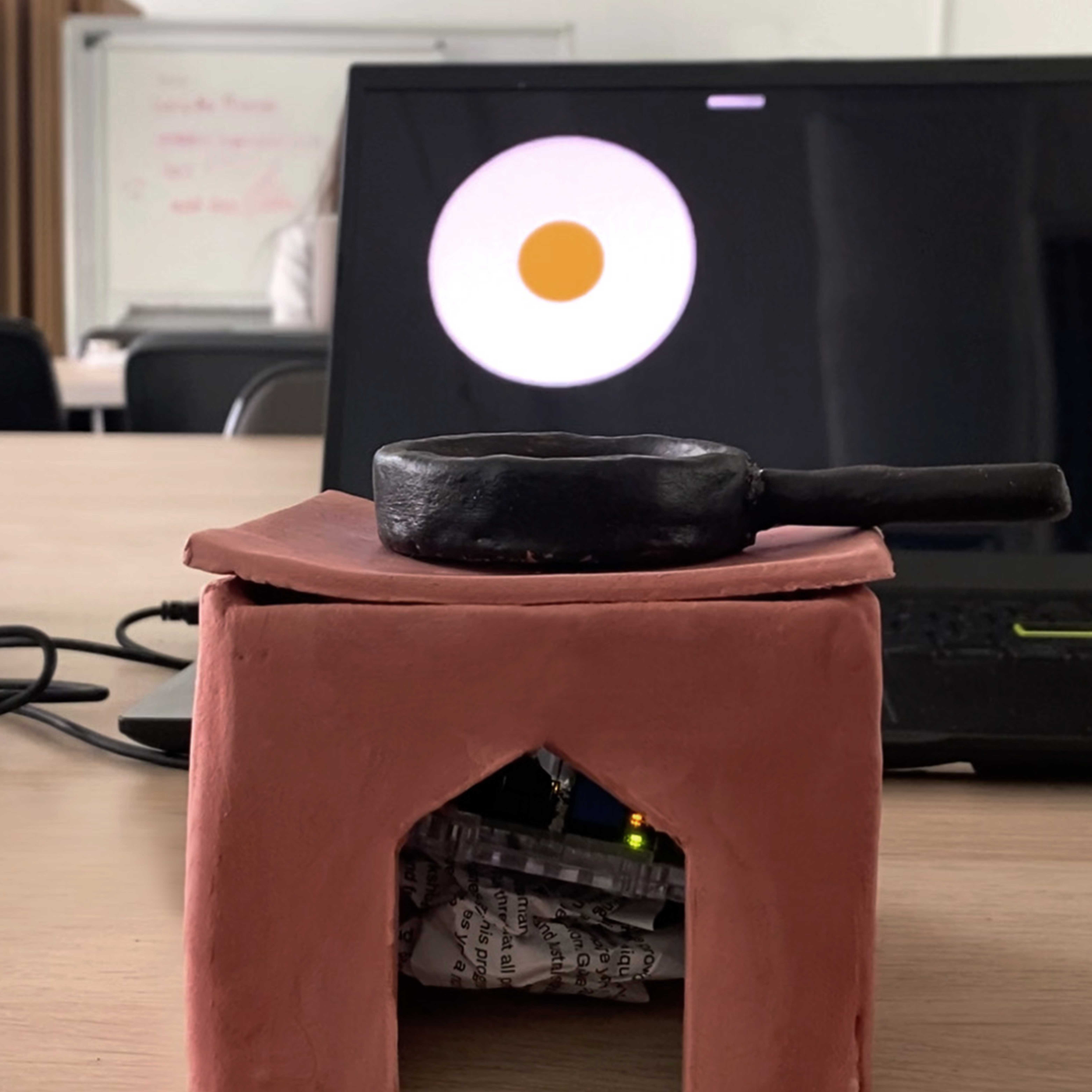 Working in a group of three, we explored the concept of creating a cooking simulator via the use of light sensors, where we sculpted a stove first out of clay then cardboard, topping it off with a mini frying pan also sculpted out of clay to emulate an egg in its hard shell dropping, then later transitioning into an egg being fried when the light sensor is covered by the frying pan.