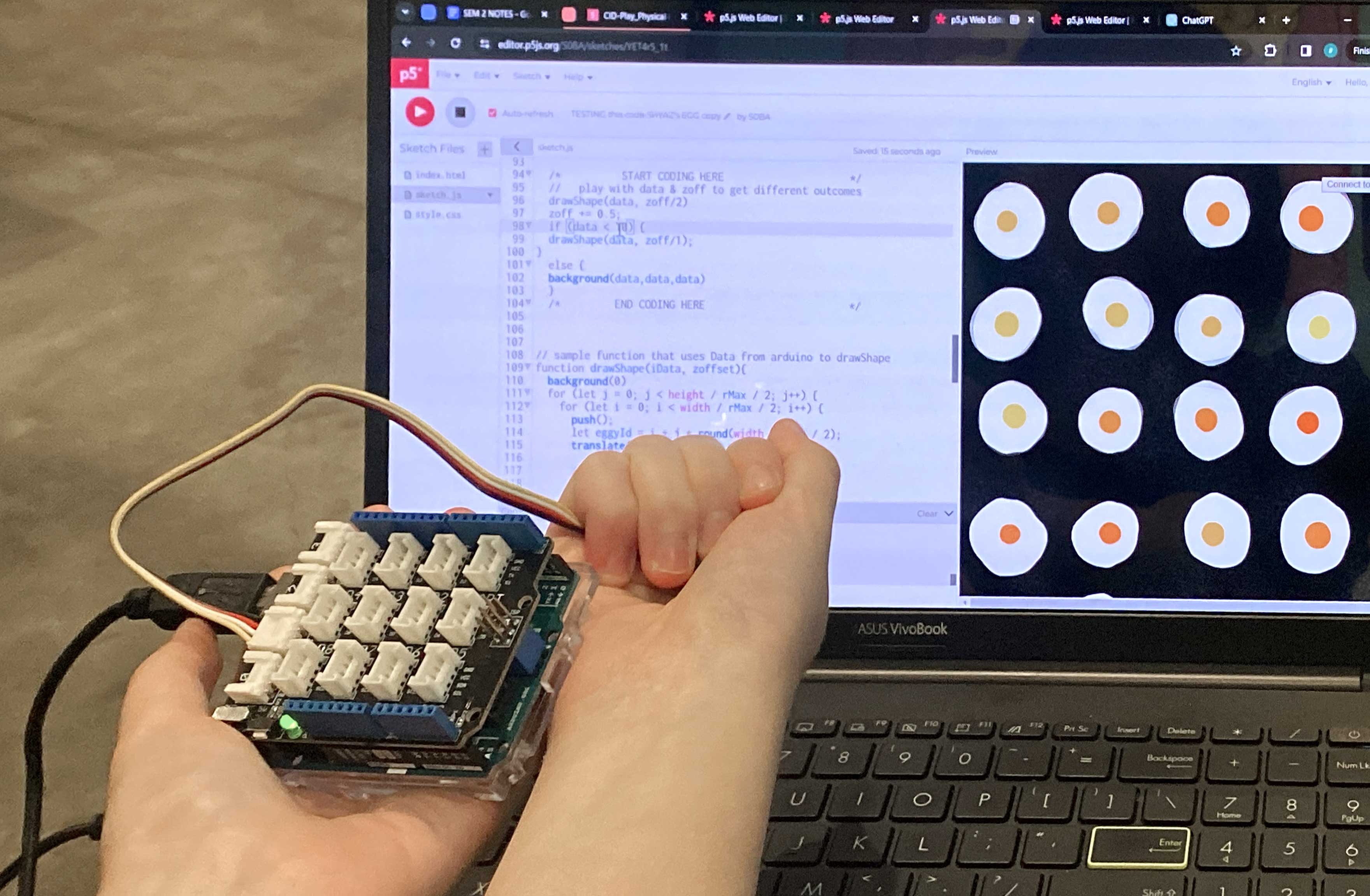 I noticed a drastic improvement in regards to coding independency this semester, especially in relation to sourcing and tweaking code that aligned with my design directions. In addition, I gained a lot more confidence working with and utilising more advanced code, demonstrating the importance of trusting oneself and the process, that growth takes time and effort.